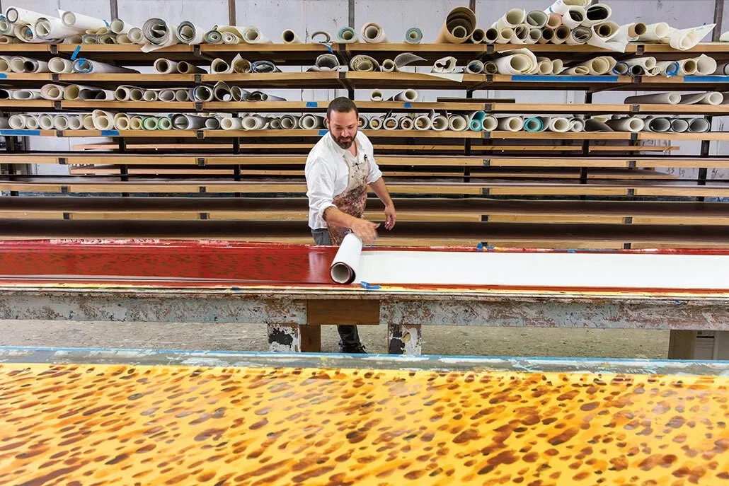 There’s a rhythm to it that’s hypnotic. Dab. Swoosh. Dab. Swoosh. Dab. Swoosh. With her paintbrush, she marks the shimmery yellow-gold paper with the darker brown-gold resin. With a quick flick of his blade (a Japanese razor I’m later told), he disperses her marks. She is Heidi Batteau, and he is Christian Batteau, and together they are the owners of Assemblage Art & Craft Manufacturing, the handmade-wall-covering firm out in the middle of Witter, Arkansas, (population 603) that caters to some of the biggest names in interiors.