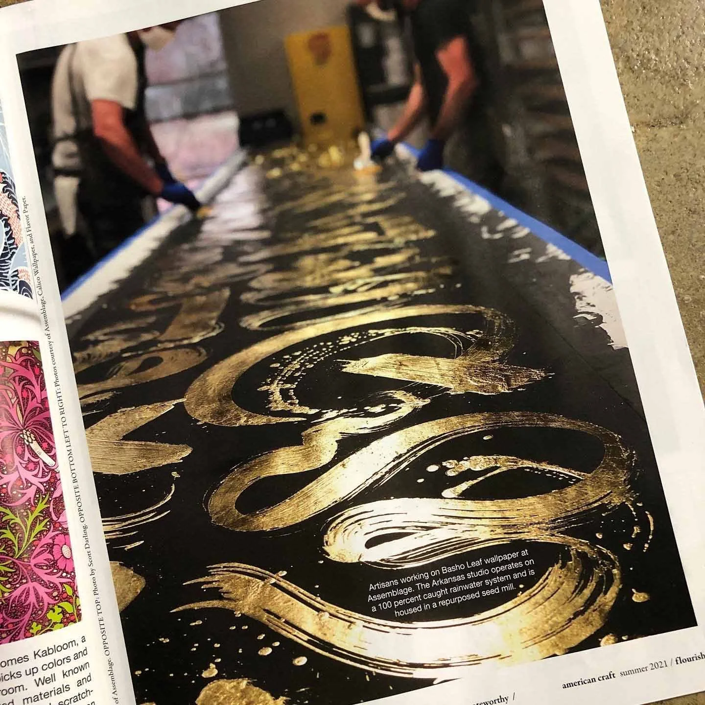 Founded in Arkansa by Christian and Heidi Batteau, Assemblage’s methods include ‘pushing marble dust, encaustic, resin, leaf and micaceous powders beyond their historical limits. In this paper from the Basho Leaf collection, calligraphic strokes of gold leaf are hand applied on marble plaster paper.