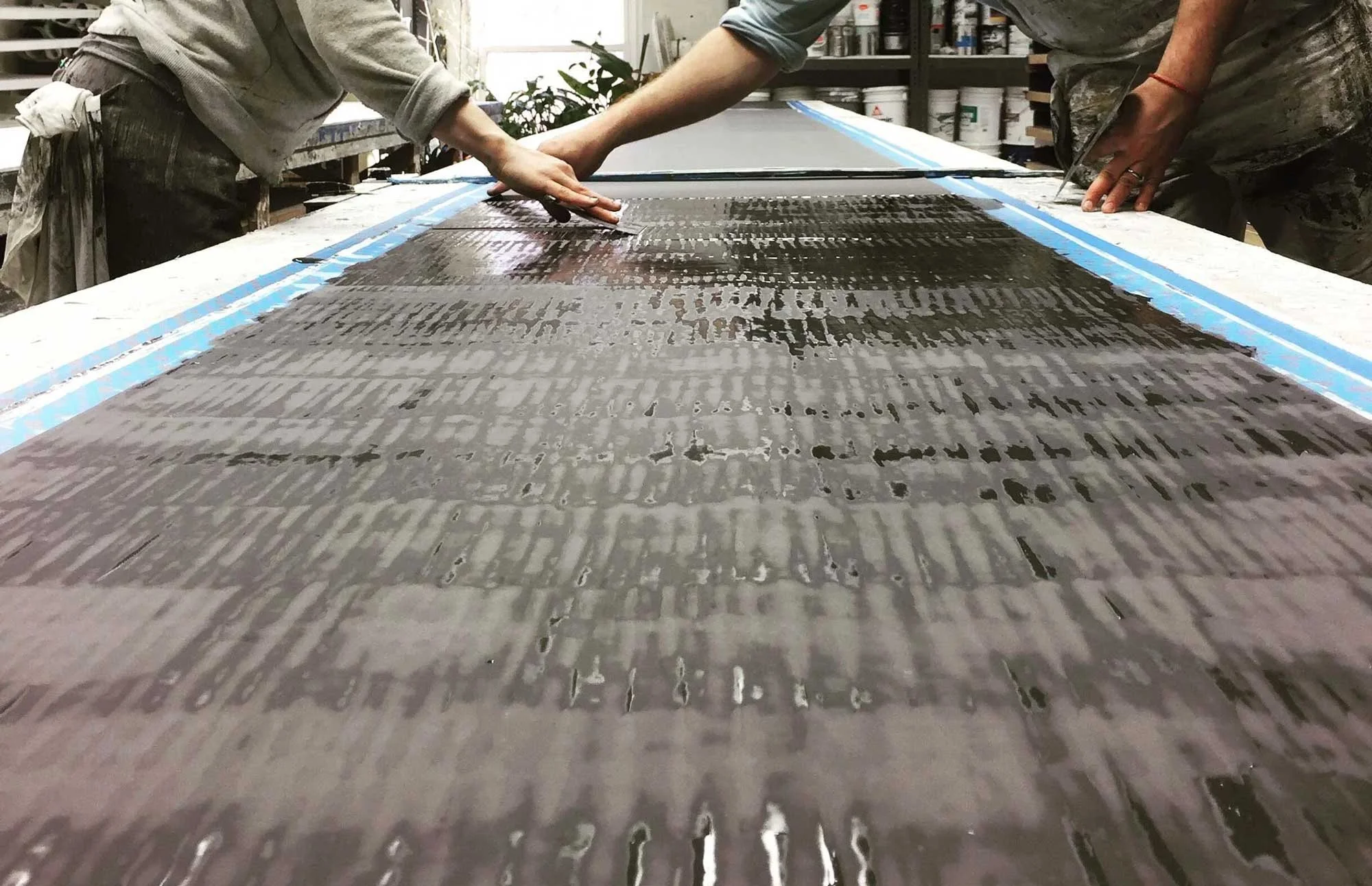 The wallpaper you grew up with was probably simple rolls of paper printed with commercial paint or ink applications, but that is not what you’ll find at ASSEMBLAGE. Their handmade process utilizes natural materials as well as the actual bodies of their staff (human “printers”) to meticulously apply the paints, plasters and other materials to the base of the paper. On a walk through the workspace, visitors might find a pile of gold leaf, marble dust, or flakes of silver and bronze scattered on the floor and tables – elements from nature that will eventually be incorporated into interior spaces located far from any kind of natural setting, but still evoke a feeling of being connected to the world beyond the city limits.