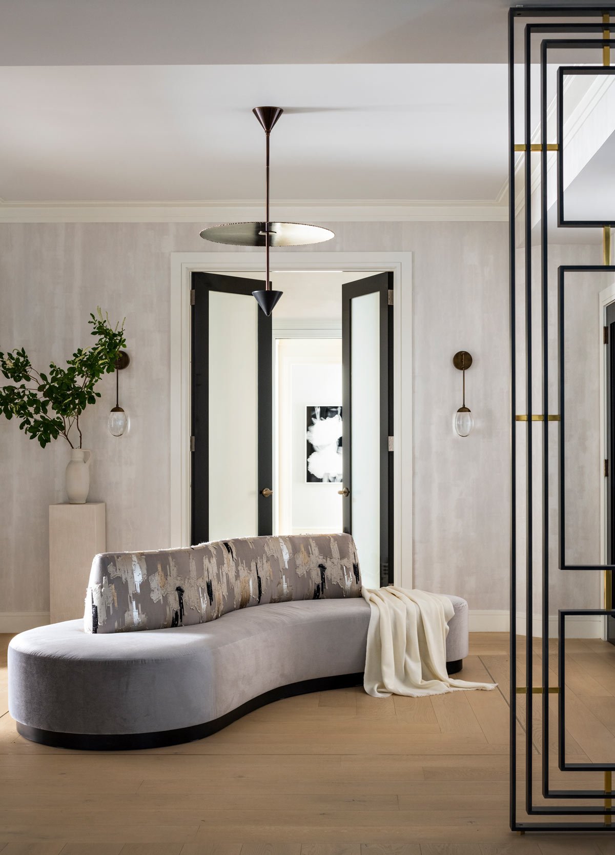Layers of hand-applied plaster encapsulating micaceous and metallic resins. This lustrous paper is reminiscent of the glowing interior of an abalone shell.