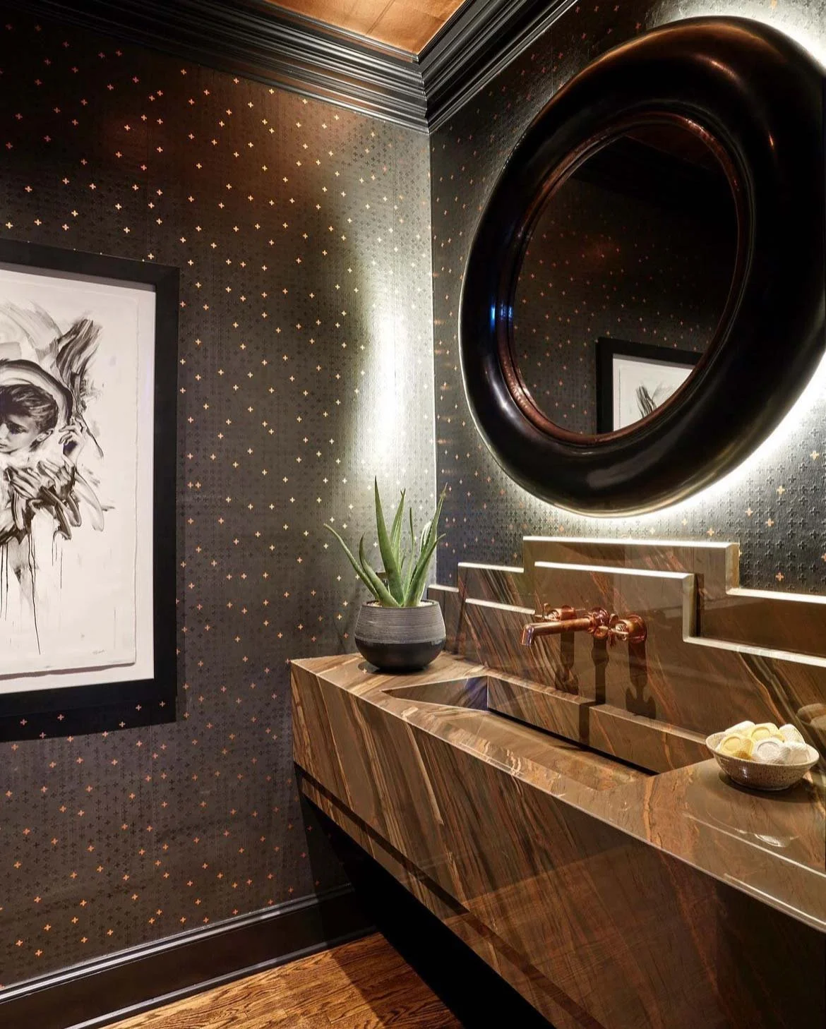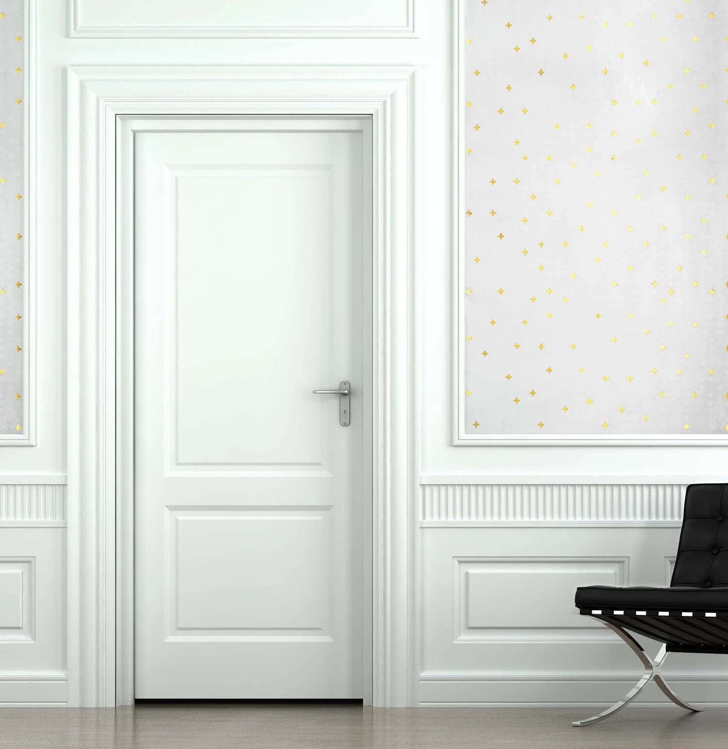 A clear unblemished sky of tiny stars gently reflecting light in this irregular grid of dimensional plaster crosses and hand-applied metal leaf.