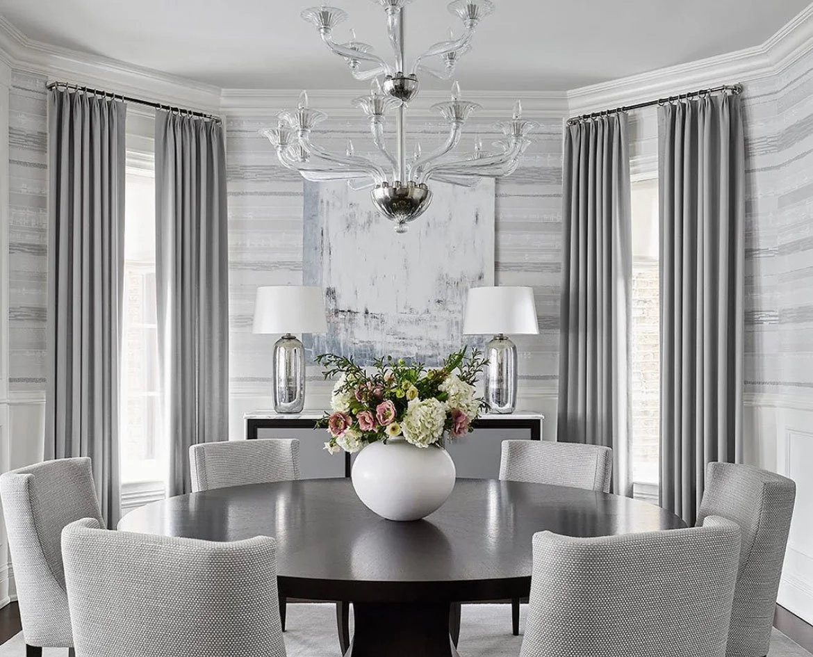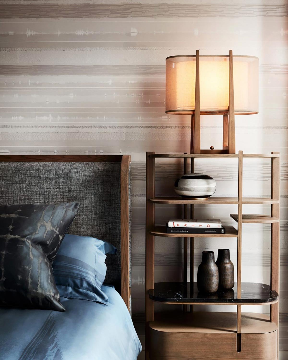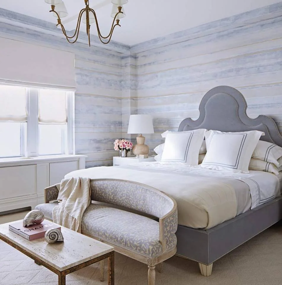 Layers upon layers of marble and mica plasters create this stratified continuous linear pattern. Finished with jewel-like lines this paper can create a horizontal pattern that wraps around the environment seamlessly or creates a dazzling vertical stripe.