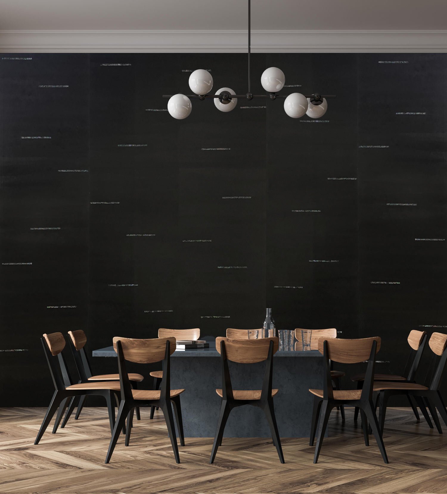 This quietly honed plaster is punctuated by exquisite horizontal dashes of inlaid mother of pearl or abalone.
